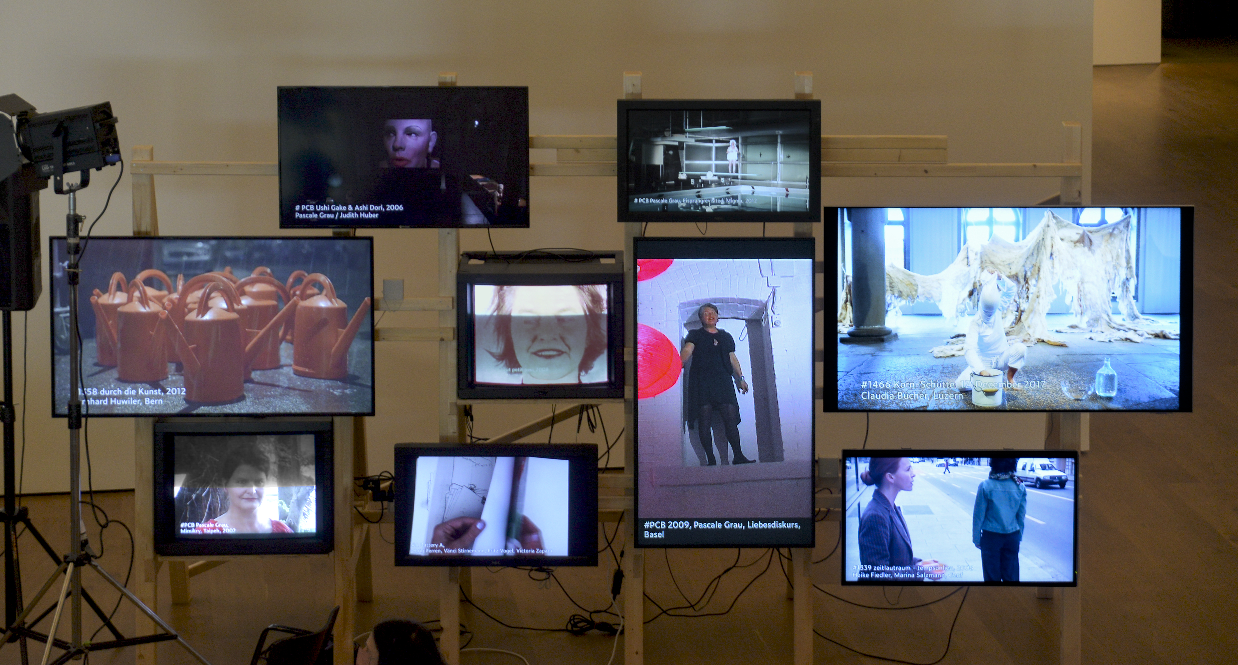 9 Kanal- Videoinstallationen Videos von Schweizer- Performancekünstler:innen gezeigt: Videointerviews, Performances für die Kamera oder Videoauszeichnungen von Performances seit den 70 er Jahren bis heute. Auf einer Videowand gab es in einem zeitlichen Rhythmus von ca. einer Stunde Verdichtungen. Auf allen Monitoren liefen gleichzeitig Arbeiten und ein Interview einer Performancepionier.in. Hier z. B. jene von Pascale Grau.